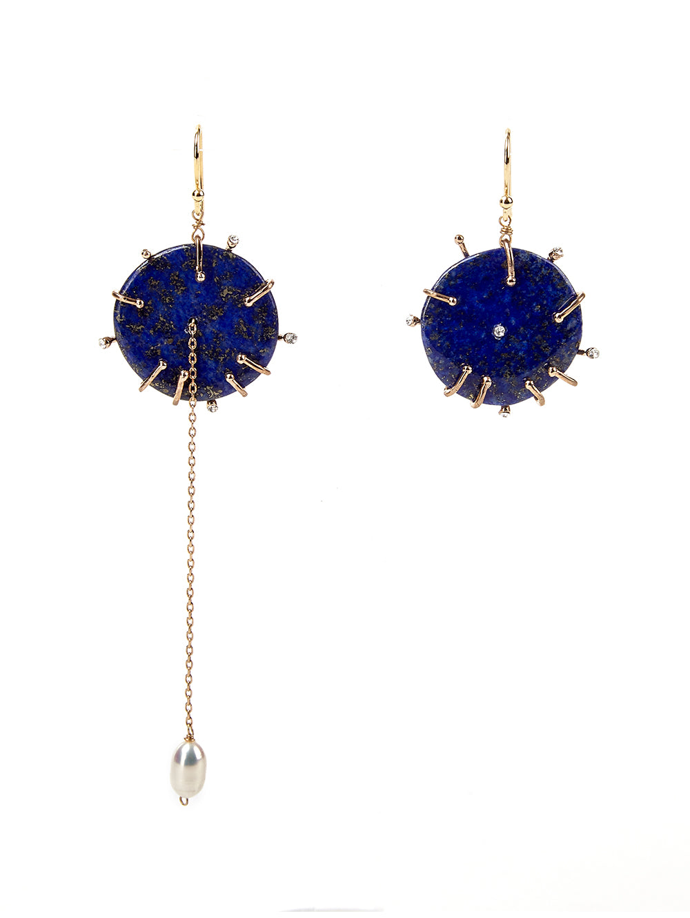 Handcrafted in Korea, these captivating asymmetric hook earrings feature deep blue Lapis Lazuli discs reminiscent of celestial bodies, accented with subtle cubic details. The left earring showcases an extended freshwater pearl drop chain, adding graceful movement and contrast. Finished with nickel-free gold-tone brass hooks, this pair blends artistic expression with elegant materials.