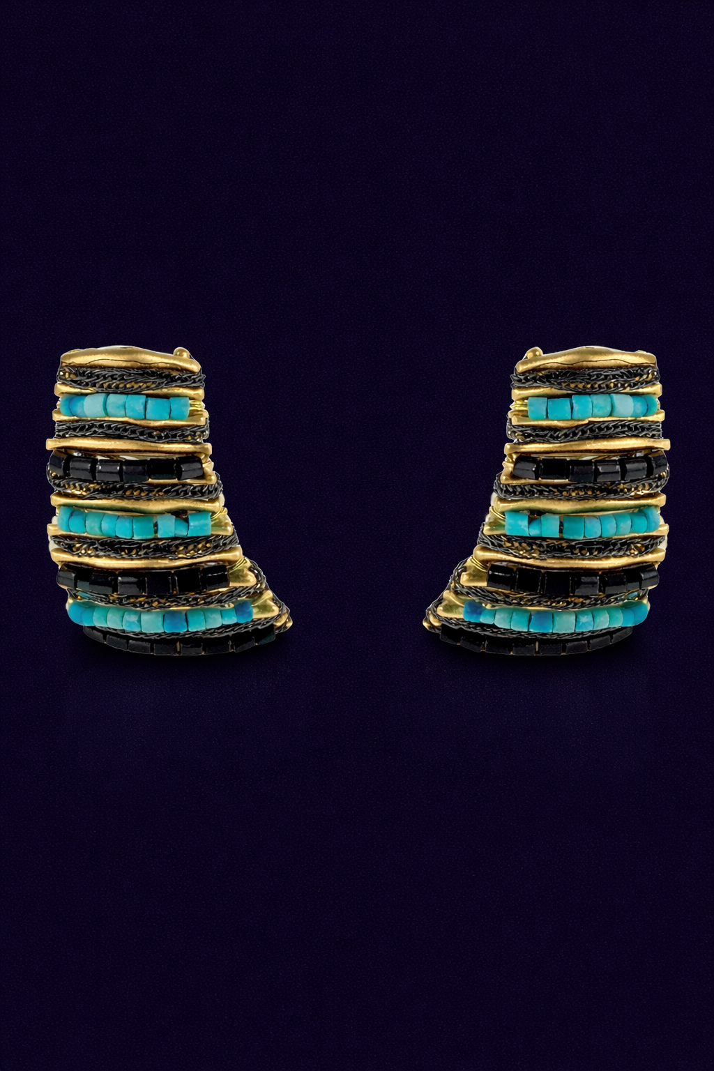 Vivid blue turquoise-tone beads are interwoven between dark metallic layers, creating a striking contrast that feels both contemporary and artisanal. Finished with silver posts for comfortable wear, the 32 mm length offers a compact statement—perfect for everyday styling while still standing out.